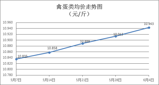 禽蛋类商品价格窄幅盘升。上周所监测的6种禽蛋类商品价格波动情况为4涨2跌,综合零售均价为10.943元/斤,环比上涨0.27%。其中:白条鸡、白条鸭零售均价分别为每斤19.73元、15.63元,环比分别上涨0.20%、下降0.64%;白壳鸡蛋、鸭蛋零售均价分别为每斤6.73元、7.93元,环比分别上涨1.05%、上涨0.38%。