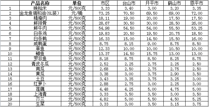 说明:1、表中价格为该地区监测点综合平均价;2、“市区”含蓬江区、江海区、新会区,价格分别采自蓬江市场、江南市场、城东市场等13家农贸市场;3、其他四个县市价格分别采自新华市场、锦江市场等8家农贸市场。
