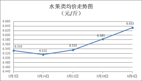 水果类商品价格总体略涨。上周所监测的6种水果商品价格波动情况为4涨2跌,综合零售均价为6.633元/斤,环比上涨0.76%。其中苹果、香蕉、葡萄零售均价分别为每斤7.42元、3.21元、13.43元,环比分别上涨0.82%、下降0.62%、上涨0.52%。