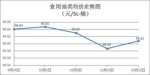 食用油类商品价格微幅盘整。上周所监测的9种食用油(5L装)商品价格波动情况为3涨2跌4平,综合零售均价为96.61元/桶,环比上涨0.02%。其中:鲁花花生油、大豆油零售均价分别为每桶157.36元、60.63元,环比分别上涨0.10%、上涨0.07%。