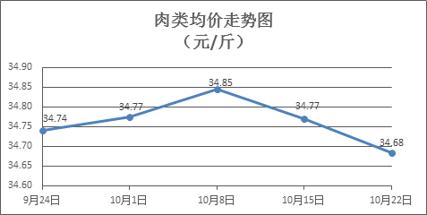 肉类商品价格略有下降。上周所监测的8种肉类商品价格波动情况为1涨7跌,综合零售均价为34.68元/斤,环比下降0.25%。其中:排骨、精瘦肉、有皮上肉、牛肉、带骨羊肉零售均价分别为每斤29.96元、19.05元、14.44元、53.83元、44.35元,环比分别下降0.40%、下降0.63%、下降0.62%、下降0.28%、下降0.22%。