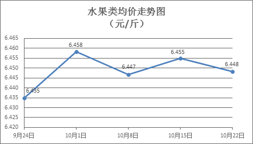 水果类商品价格小幅波动。上周所监测的6种水果商品价格波动情况为2涨2跌2平,综合零售均价为6.448元/斤,环比下降0.10%。其中苹果、香蕉、梨零售均价分别为每斤7.32元、3.07元、5.99元,环比分别持平、上涨0.66%、下降0.83%。