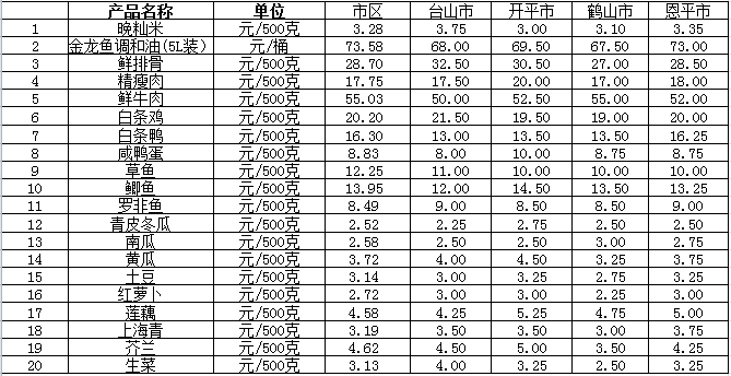 说明:1、表中价格为该地区监测点综合平均价;2、“市区”含蓬江区、江海区、新会区,价格分别采自蓬江市场、江南市场、城东市场等13家农贸市场;3、其他四个县市价格分别采自新华市场、锦江市场等8家农贸市场。