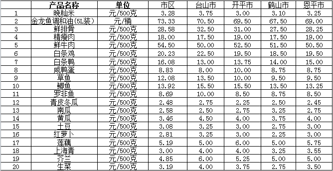 说明:1、表中价格为该地区监测点综合平均价;2、“市区”含蓬江区、江海区、新会区,价格分别采自蓬江市场、江南市场、城东市场等13家农贸市场;3、其他四个县市价格分别采自新华市场、锦江市场等8家农贸市场。