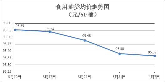 食用油类价格稳中微降。所监测的9种食用油(5L装)商品价格波动情况为1涨2跌6平,综合零售均价为每桶95.37元,环比下降0.02%。其中:鲁花花生油、金龙油调和油零售均价分别为每桶152.40元、71.36元,环比分别下降0.13%、上涨0.18%。