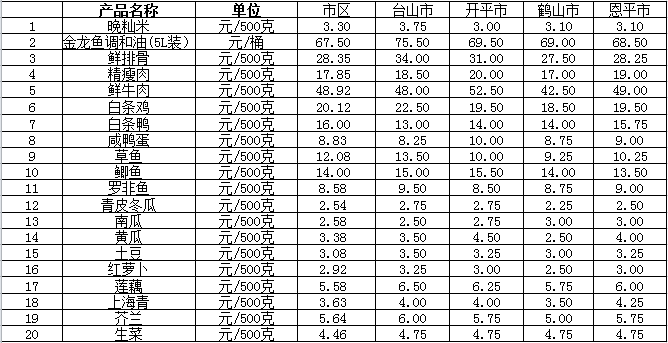 说明:1、表中价格为该地区监测点综合平均价;2、“市区”含蓬江区、江海区、新会区,价格分别采自蓬江市场、江南市场、城东市场等13家农贸市场;3、其他四个县市价格分别采自新华市场、锦江市场等8家农贸市场。