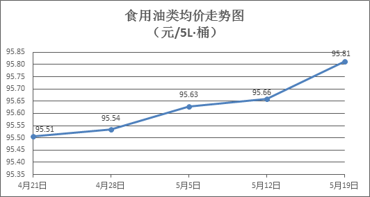 食用油类价格微幅下降。所监测的9种食用油(5L装)商品价格波动情况为2涨4跌3平,综合零售均价为每桶95.80元,环比下降0.02%。其中:鲁花花生油、金龙油花生油零售均价分别为每桶154.37元、103.86元,环比分别上涨0.03%、下降0.12%。