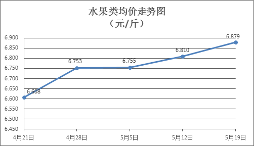 水果类商品价格有所上涨。所监测的6种水果商品价格波动情况为8涨2跌,综合零售均价为每斤6.878元,环比上涨1.00%。其中橙子、苹果、葡萄零售均价分别为每斤5.76元、7.52元、15.53元,环比分别上涨1.23%、上涨0.94%、上涨1.97%。
