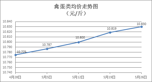 禽蛋类商品价格升降互现。所监测的6种禽蛋类商品价格波动情况为2涨2跌2平,综合零售均价为每斤10.830元,环比上涨0.11%。其中:白条鸡、白条鸭零售均价分别为每斤20.02元、14.98元,环比分别下降0.03%、持平;白壳鸡蛋、咸鸭蛋零售均价分别为每斤6.29元、8.93元,环比分别下降0.63%、上涨0.68%。