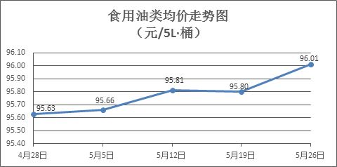 食用油类价格总体回升。所监测的9种食用油(5L装)商品价格波动情况为6涨1跌2平,综合零售均价为每桶96.01元,环比上涨0.23%。其中:鲁花花生油、金龙油花生油零售均价分别为每桶154.43元、103.92元,环比分别上涨0.04%、上涨0.06%。