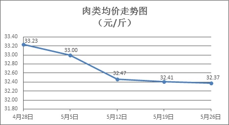 肉类商品价格有所微降。所监测的8种肉类商品价格波动情况为3涨5跌,综合零售均价为每斤32.37元,环比下降0.11%。其中:排骨、有皮上肉、牛肉、带骨羊肉零售均价分别为每斤29.42元、14.21元、48.41元、42.83元,环比分别上涨0.10%、下降0.21%、上涨0.06%、下降0.33%。