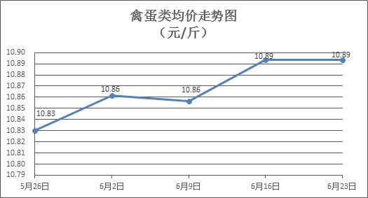 禽蛋类商品价格微幅盘整。所监测的6种禽蛋类商品价格波动情况为2涨3跌1平,综合零售均价为每斤10.89元,环比持平。其中:白条鸡、白条鸭零售均价分别为每斤20.22元、14.99元,环比分别上涨0.35%、下降0.13%;白壳鸡蛋、鸭蛋零售均价分别为每斤6.36元、7.50元,环比分别下降0.47%、下降0.40%。