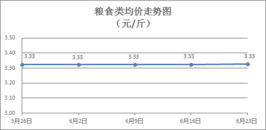 粮食类商品价格基本平稳。所监测的6种粮食类商品价格波动情况为2涨1跌3平,零售均价为每斤3.33元,环比上涨0.05%。其中:晚籼米、丝苗米、富强粉零售均价分别为每斤3.26元、3.55元、3.37元,环比分别持平、下降0.28%、上涨0.30%。