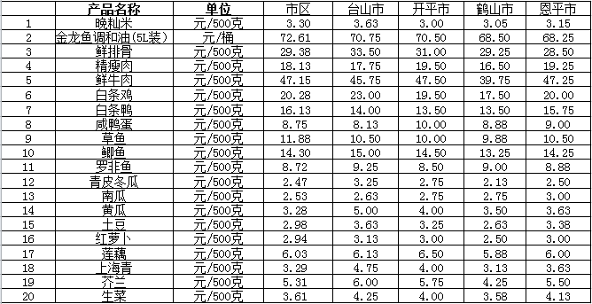 说明:1、表中价格为该地区监测点综合平均价;2、“市区”含蓬江区、江海区、新会区,价格分别采自蓬江市场、江南市场、城东市场等13家农贸市场;3、其他四个县市价格分别采自新华市场、锦江市场等8家农贸市场。