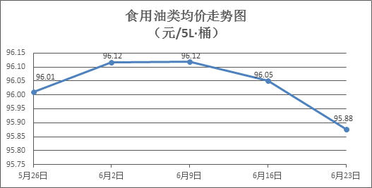 食用油类商品价格微幅下降。所监测的9种食用油(5L装)商品价格波动情况为2涨6跌1平,综合零售均价为每桶95.88元,环比下降0.18%。其中:鲁花花生油、玉米油零售均价分别为每桶154.13元、76.65元,环比分别下降0.17%、下降0.39%。