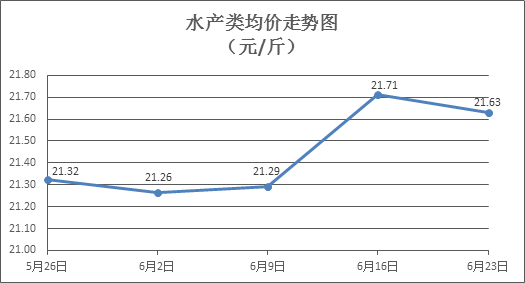 水产类商品价格涨跌互现。所监测的10种水产商品价格波动情况为4涨5跌1平,综合均价为每斤21.63元,环比下降0.36%。其中:草鱼、鲫鱼、鲈鱼、罗非鱼、基围虾零售均价分别为每斤11.09元、14.31元、21.10元、8.85元、30.61元,环比分别下降3.73%、下降0.62%、上涨2.38%、上涨0.57%、下降1.70%。