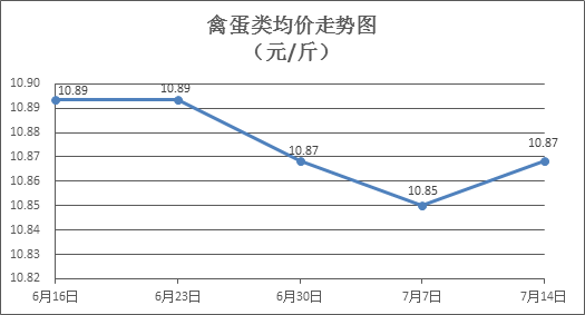 禽蛋类商品价格总体微涨。所监测的6种禽蛋类商品价格波动情况为3涨2跌1平,综合零售均价为每斤10.87元,环比上涨0.18%。其中:白条鸡、白条鸭零售均价分别为每斤20.08元、15.04元,环比分别下降0.15%、上涨0.20%;白壳鸡蛋、咸鸭蛋零售均价分别为每斤6.38元、8.95元,环比分别上涨1.11%、下降0.11%。