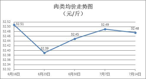 肉类商品价格小幅波动。所监测的8种肉类商品价格波动情况为4涨3跌1平,综合零售均价为每斤32.48元,环比下降0.05%。其中:排骨、精瘦肉、牛肉、带骨羊肉零售均价分别为每斤30.45元、18.51元、46.67元、43.85元,环比分别上涨0.59%、上涨0.05%、上涨0.15%、下降0.75%。
