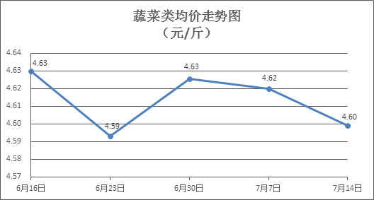 蔬菜类商品价格以降为主。所监测的32 种蔬菜商品价格波动情况为10涨21跌1平,综合零售均价为每斤4.60元,环比下降0.51%。其中:涨幅居前的品种包括青尖椒、黄瓜、花菜,零售均价分别为每斤4.96元、4.26元、4.99元,环比分别上涨5.31%、4.93%、4.18%;跌幅靠前的品种包括水空心菜、丝瓜、青豆角,零售均价分别为每斤3.80元、4.56元、5.14元,环比分别下降6.17%、5.59%、4.64%。