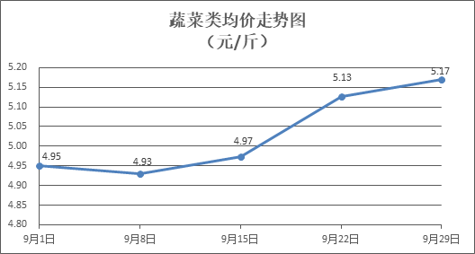 蔬菜类商品价格以涨为主。所监测的32 种蔬菜商品价格波动情况为21涨10跌1平,综合零售均价为每斤5.17元,环比上涨0.87%。其中:涨幅居前的品种包括西红柿、花菜、本地菜心,零售均价分别为每斤5.69元、6.35元、6.44元,环比分别上涨6.75%、6.72%、4.89%;跌幅靠前的品种包括西洋菜、青豆角、丝瓜,零售均价分别为每斤6.24元、5.72元、5.15元,环比分别下降3.41%、2.72%、1.90%。