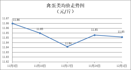 禽蛋类商品价格小幅波动。所监测的5种禽蛋类商品价格波动情况为2涨2跌1平,综合零售均价为每斤11.85元,环比下降0.02%。其中:白条鸡、白条鸭零售均价分别为每斤20.46元、15.33元,环比分别上涨0.34%、下降0.07%;鸡蛋、鸭蛋零售均价分别为每斤6.55元、7.71元,环比分别上涨0.15%、下降1.03%。