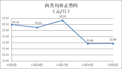 肉类商品价格微幅盘整。所监测的8种肉类商品价格波动情况为3涨4跌1平,综合零售均价为每斤32.46元,环比持平。其中:排骨、精瘦肉、牛肉、带骨羊肉零售均价分别为每斤32.16元、20.05元、45.75元、41.62元,环比分别上涨0.19%、持平、下降0.11%、下降0.12%。