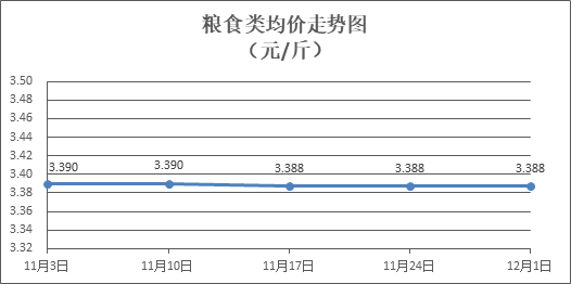 粮食类商品价格保持稳定。所监测的4种粮食类商品价格均持平,零售均价为每斤3.388元。其中:油粘米、富强粉零售均价分别为每斤3.51元、3.36元,环比均持平。