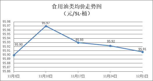食用油类商品价格基本平稳。所监测的9种食用油(5L装)商品价格波动情况为1涨1跌7平,综合零售均价为每桶95.91元,环比下降0.02%。其中:金龙鱼花生油、菜籽油零售均价为每桶102.70元、73.67元,环比分别上涨0.03%、下降0.22%。
