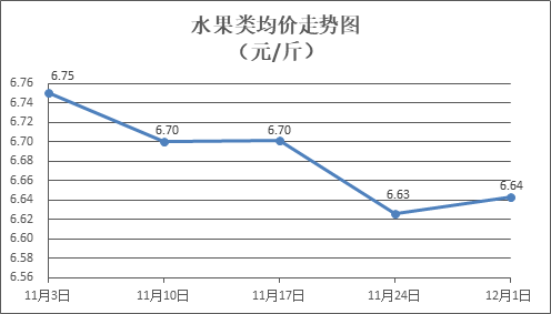 水果类商品价格微幅上涨。所监测的6种水果商品价格波动情况为3涨1跌2平,综合零售均价为每斤6.64元,环比上涨0.25%。其中橙子、苹果、葡萄零售均价分别为每斤6.13元、7.43元、13.51元,环比分别下降0.16%、上涨0.13%、上涨0.52%。