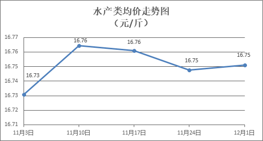 水产类商品价格升降互现。所监测的9种水产商品价格波动情况为4涨3跌2平,综合均价为每斤16.75元,环比上涨0.02%。其中:草鱼、鲫鱼、罗非鱼、鳙鱼、基围虾零售均价分别为每斤11.00元、13.93元、9.10元、10.86元、29.72元,环比分别持平、上涨0.14%、上涨1.00%、上涨0.74%、下降0.10%。