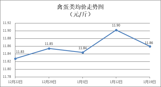 禽蛋类商品价格稳中略降。所监测的5种禽蛋类商品价格波动情况为1涨2跌2平,综合零售均价为每斤11.86元,环比下降0.35%。其中:白条鸡、白条鸭零售均价分别为每斤20.72元、15.20元,环比分别下降1.00%、下降0.07%;鸡蛋、咸鸭蛋零售均价分别为每斤6.57元、9.14元,环比分别上涨0.15%、持平。