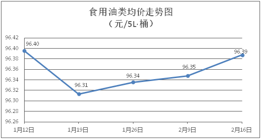 食用油类商品价格基本平稳。所监测的9种食用油(5L装)商品价格波动情况为2涨3跌4平,综合零售均价为每桶96.39元,环比上涨0.04%。其中:鲁花花生油、玉米油零售均价为每桶156.04元、76.67元,环比分别上涨0.05%、下降0.09%。