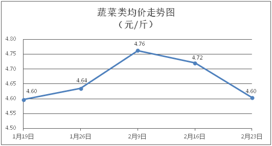 据本市21家农贸市场监测数据显示,上周(2月17日至2月23日)市场上各类“菜篮子”商品供应充足,所监测的7大类“菜篮子”商品价格环比总体表现为1涨4跌2平。其中:粮油类商品价格基本平稳,肉禽蛋类、蔬菜类、水产类商品价格小幅下降,水果类价格总体略涨。