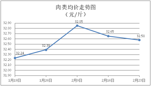 肉类商品价格窄幅盘降。所监测的8种肉类商品价格波动情况为3涨5跌,综合零售均价为每斤32.58元,环比下降0.22%。其中:排骨、精瘦肉、牛肉、带骨羊肉零售均价分别为每斤31.60元、19.73元、46.59元、41.38元,环比分别下降0.47%、下降1.40%、上涨0.04%、下降0.81%。