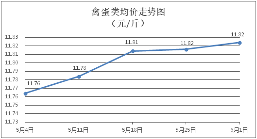 禽蛋类商品价格稳中略涨。所监测的5种禽蛋类商品价格波动情况为1涨4平,综合零售均价为每斤11.82元,环比上涨0.07%。其中:白条鸡、白条鸭零售均价分别为每斤20.75元、15.31元,环比分别持平、上涨0.26%;鸡蛋、鸭蛋零售均价分别为每斤6.65元、7.20元,环比均持平。