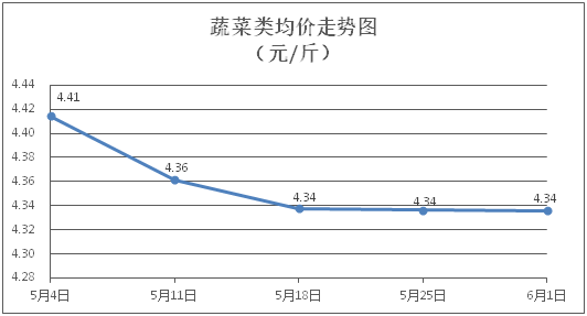蔬菜类商品价格升降互现。所监测的32 种蔬菜商品价格波动情况为14涨14跌4平,综合零售均价为每斤4.34元,环比下降0.01%。其中:涨幅居前的品种包括花菜、莲藕、丝瓜,零售均价分别为每斤4.37元、5.23元、4.56元,环比分别上涨5.81%、3.16、2.70%;跌幅靠前的品种包括青豆角、白苋菜、本地菜心,零售均价分别为每斤5.33元、3.95元、4.58元,环比分别下降4.65%、4.36%、2.35%。