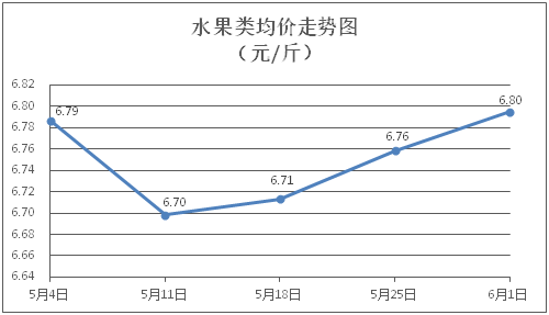 水果类商品价格略有上涨。所监测的6种水果商品价格波动情况为3涨2跌1平,综合零售均价为每斤6.80元,环比上涨0.54%。其中香蕉、葡萄零售均价分别为每斤3.42元、14.53元,环比分别持平、上涨1.40%。