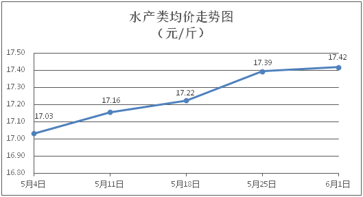 水产类商品价格窄幅盘整。所监测的9种水产商品价格波动情况为4涨4跌1平,综合均价为每斤17.42元,环比上涨0.14%。其中:草鱼、鲫鱼、罗非鱼、基围虾零售均价分别为每斤11.21元、14.34元、9.10元、30.73元,环比分别下降0.18%、上涨0.14%、下降0.55%、上涨0.16%。