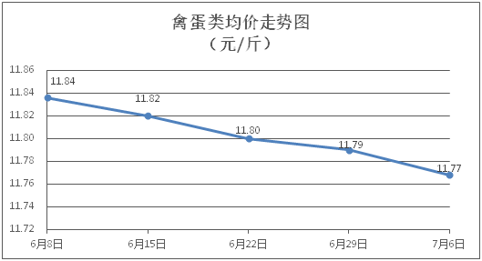 禽蛋类商品价格继续微降。所监测的5种禽蛋类商品价格波动情况为1涨3跌1平,综合零售均价为每斤11.77元,环比下降0.19%。其中:白条鸡、白条鸭零售均价分别为每斤20.55元、15.42元,环比分别下降0.39%、上涨0.06%;鸡蛋、鸭蛋零售均价分别为每斤6.58元、7.11元,环比分别下降0.30%、下降0.28%。