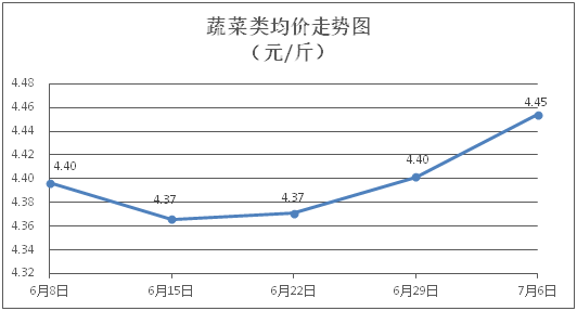 蔬菜类商品价格普遍上涨。所监测的32 种蔬菜商品价格波动情况为23涨7跌2平,综合零售均价为每斤4.45元,环比上涨1.19%。其中:涨幅居前的品种包括苦瓜、奶白菜、本地菜心,零售均价分别为每斤4.41元、5.03元、4.77元,环比分别上涨6.52%、3.50%、3.47%;跌幅靠前的品种包括红萝卜、茄子、蒜头,零售均价分别为每斤3.02元、3.67元、8.50元,环比分别下降1.63%、1.61%、1.39%。