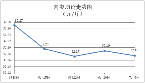 肉类商品价格微幅盘整。所监测的8种肉类商品价格波动情况为3涨4跌1平,综合零售均价为每斤32.18元,环比下降0.05%。其中:排骨、精瘦肉、肋条肉、牛肉、带骨羊肉零售均价分别为每斤30.20元、18.94元、15.84元、46.68元、42.21元,环比分别上涨0.17%、下降0.05%、上涨0.13%、下降0.04%、下降0.40%。
