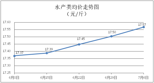 水产类商品价格涨势延续。所监测的9种水产商品价格波动情况为4涨2跌3平,综合均价为每斤17.57元,环比上涨0.36%。其中:草鱼、鲫鱼、淡水鲈鱼、基围虾零售均价分别为每斤11.20元、14.29元、22.64元、30.70元,环比分别下降0.09%、上涨0.78%、上涨0.40%、上涨0.29%。