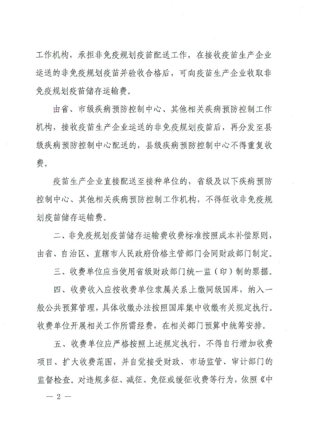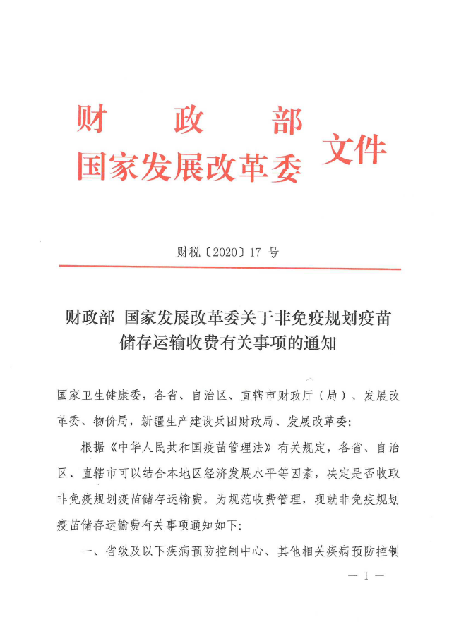 财政部 国家发展改革委关于非免疫规划疫苗储存运输收费有关事项的通知(财税[2020]17号)