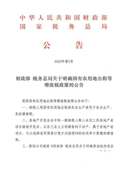 财政部+税务总局关于明确国有农用地出租等增值税政策的公告