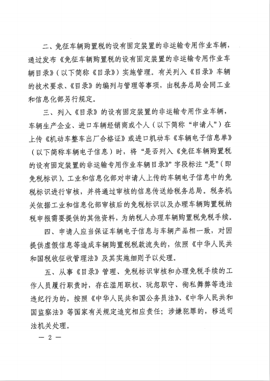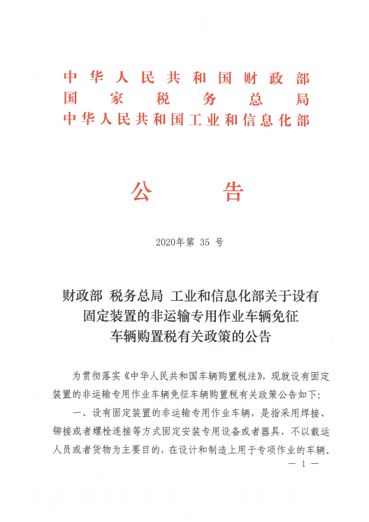 财政部+税务总局+工业和信息化部关于设有固定装置的非运输专用作业车辆免征车辆购置税有关政策的公告
