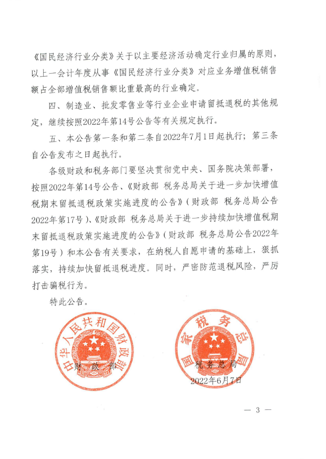 财政部 税务总局关于扩大全额退还增值税留抵税额政策行业范围的公告