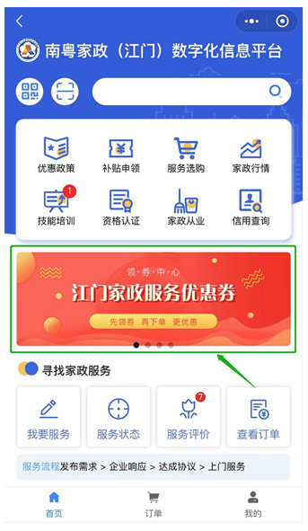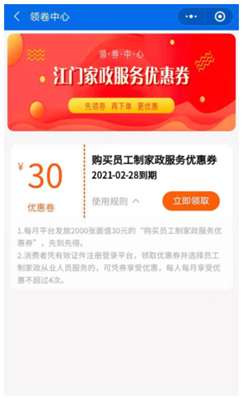各位市民可登录“五邑人社”微信小程序点击领取“江门家政优惠券”,选择标志可使用优惠券的家政服务公司,订单完成后选择优惠券进行支付。
