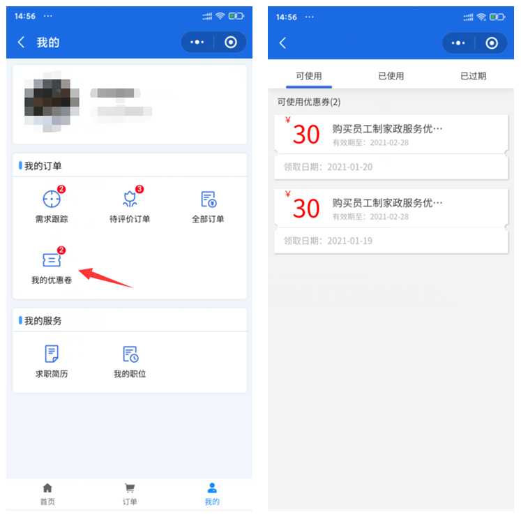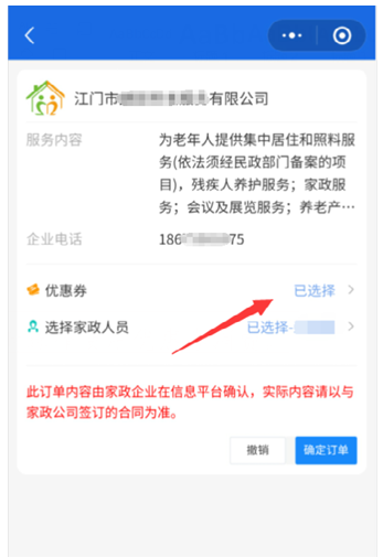 参加家政优惠券活动的商家在平台上会有“可使用优惠券”的标识,消费者通过平台发起家政服务订单时,可以选择使用自己已领取的优惠券,服务完成后向商家支付优惠后的金额。