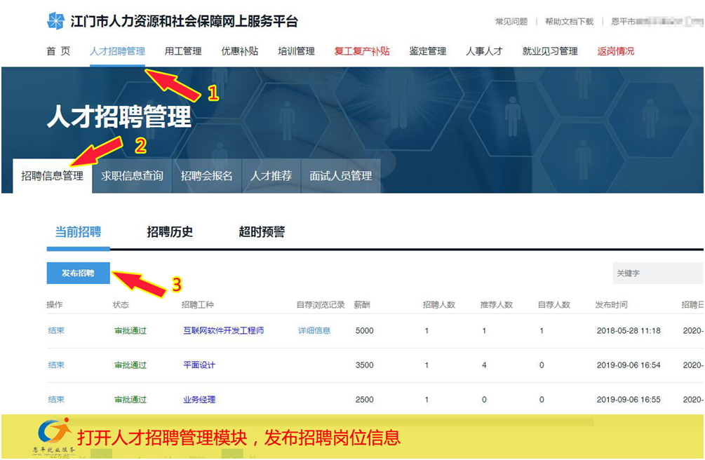 有招聘需求企业可通过登录“江门市人力资源和社会保障网上服务平台”