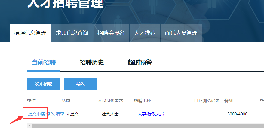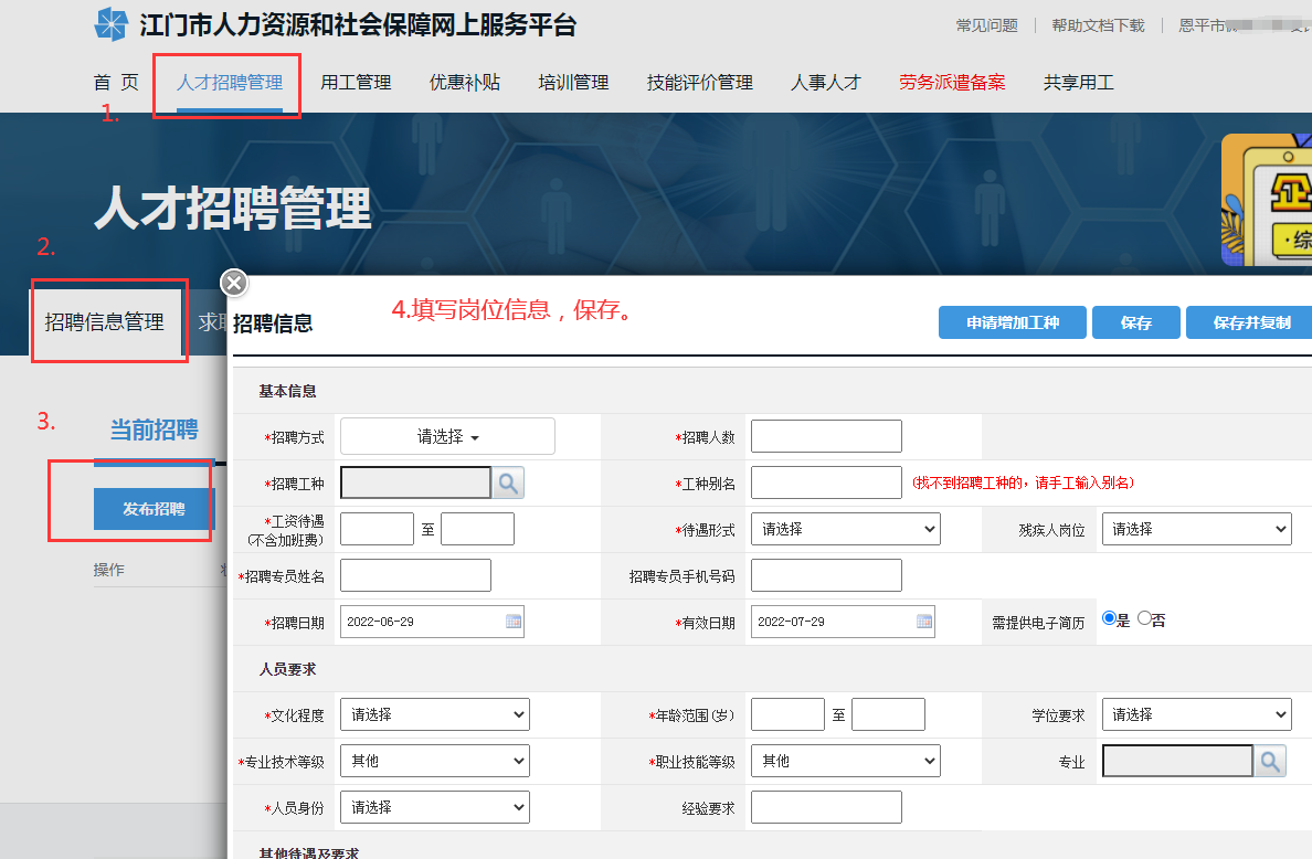 进入“人才招聘管理”模块,选择“招聘信息管理”,点击“发布招聘”,填写岗位信息(红色带*为必录项),保存、提交。
